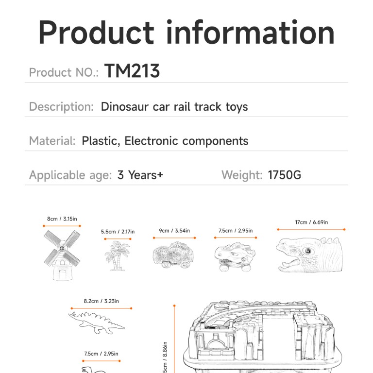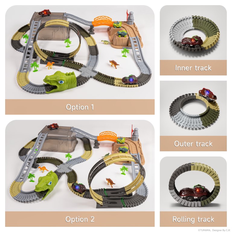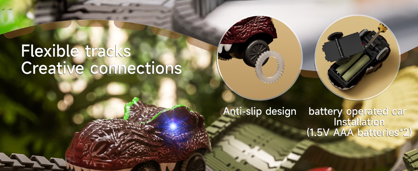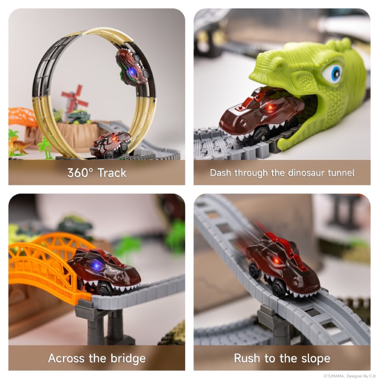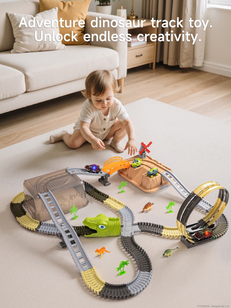 Bring prehistoric excitement home with our Dinosaur Track Toy Set! Watch as glowing-eyed dino cars (T-Rex & Triceratops) race through 360° loops, bridges, and dinosaur tunnels, bringing the Jurassic world to life. The flexible track system lets kids build endless layouts, while realistic dinosaur figures (Spinosaurus, Stegosaurus) spark imaginative play. Perfect for ages 3+, this set includes palm trees, a windmill, and 2-in-1 storage that transforms into part of the track!