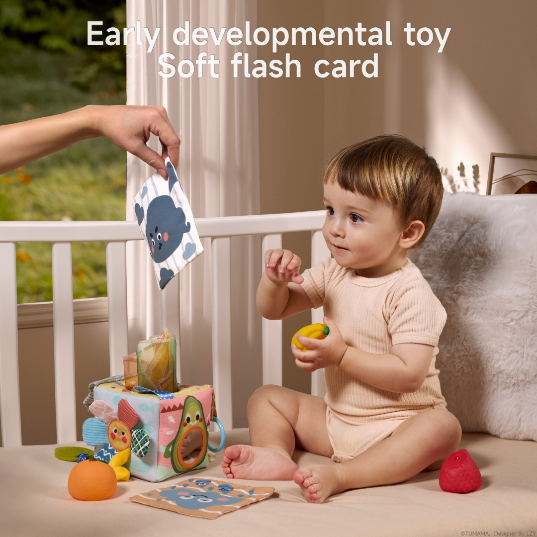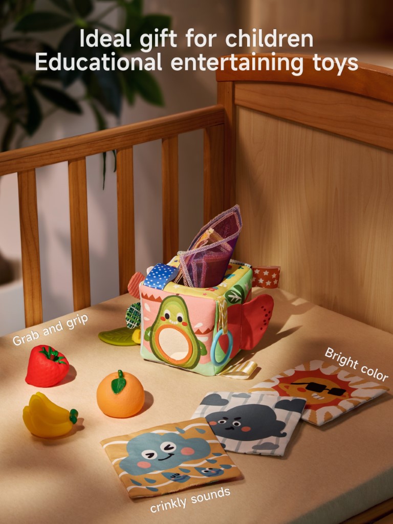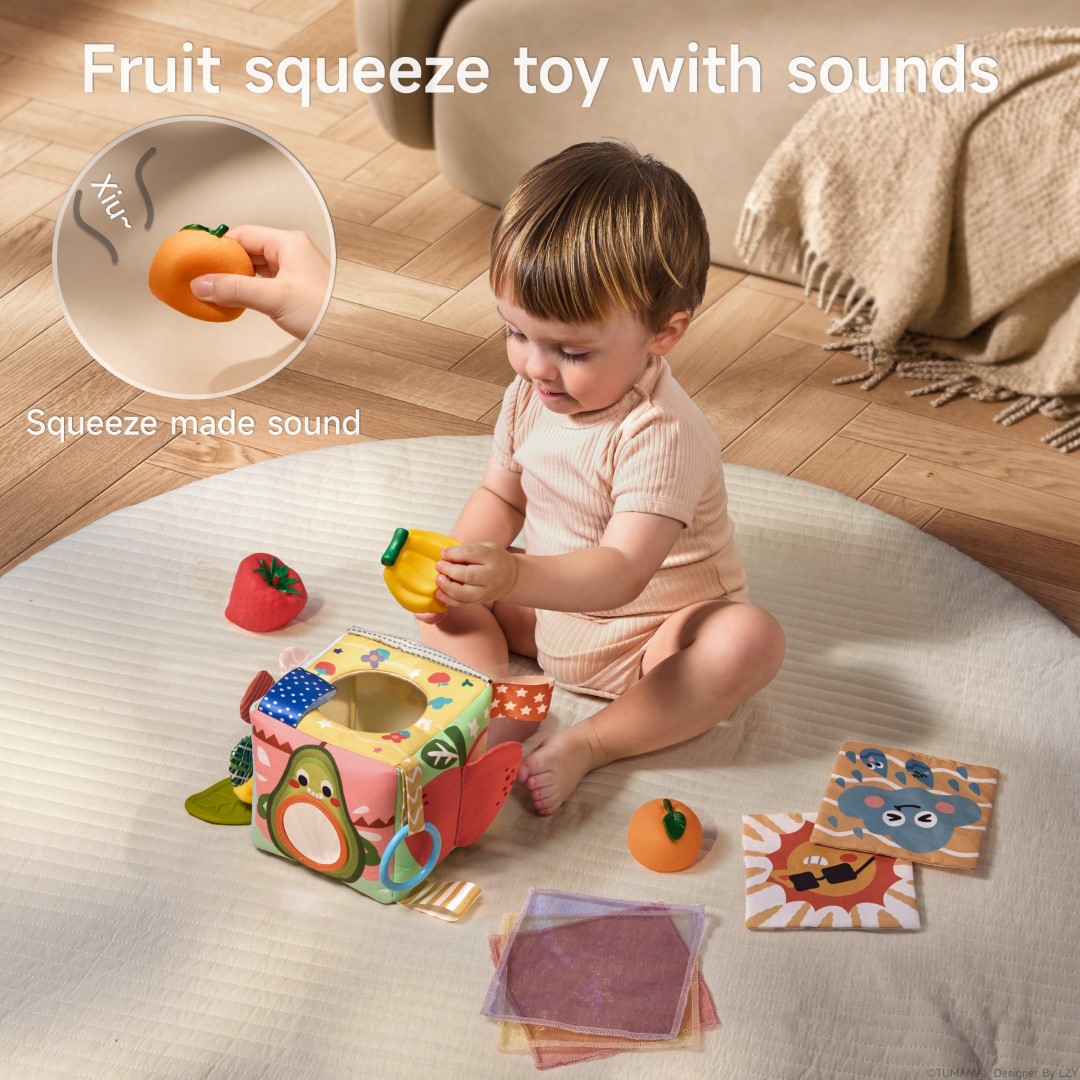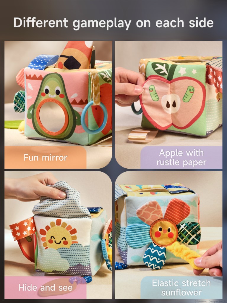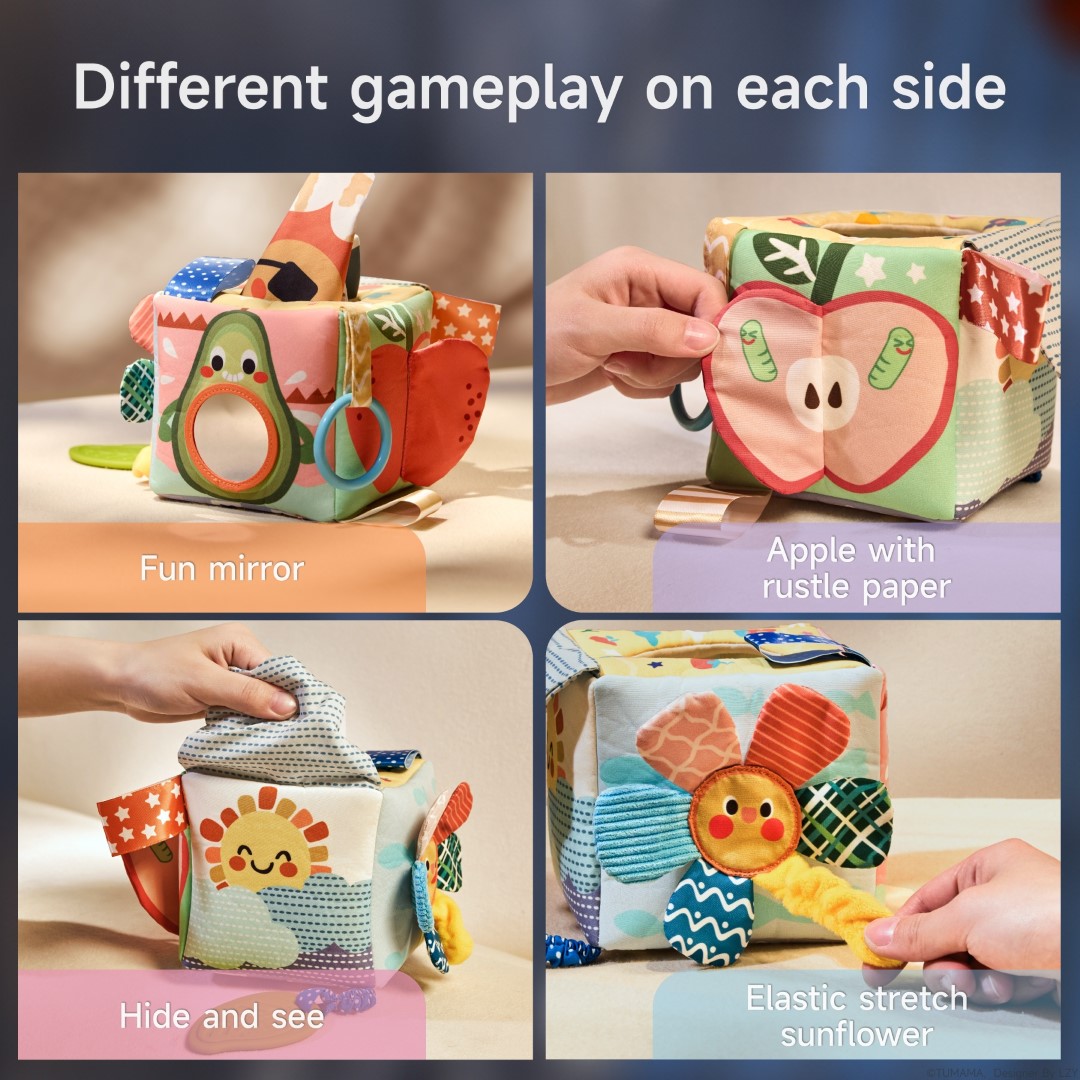 Each side of the tissue box offers a unique activity: a fun mirror for self-discovery, an apple and cloud with rustling (crinkle) paper, an elastic stretch sunflower, and textured tails. The included soft flash cards display playful weather illustrations, and the fruit squeeze toys make engaging sounds—helping develop fine motor skills, hand-eye coordination, and early cognitive abilities.
