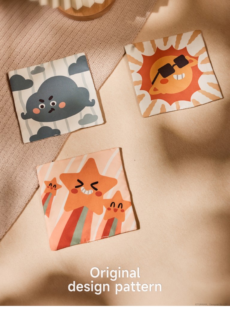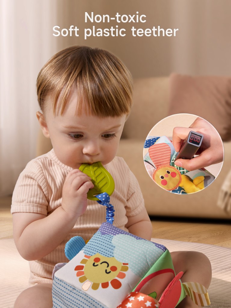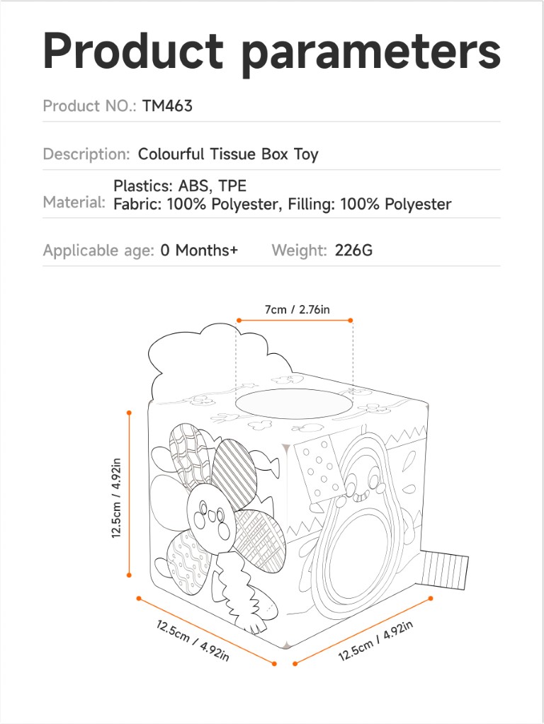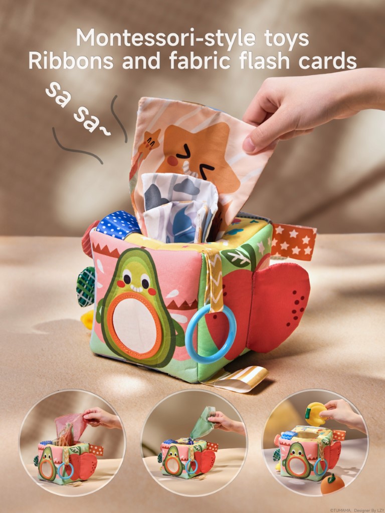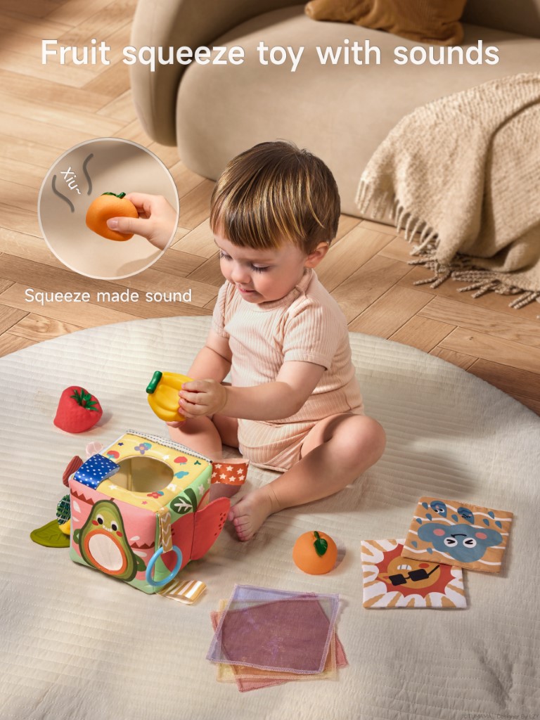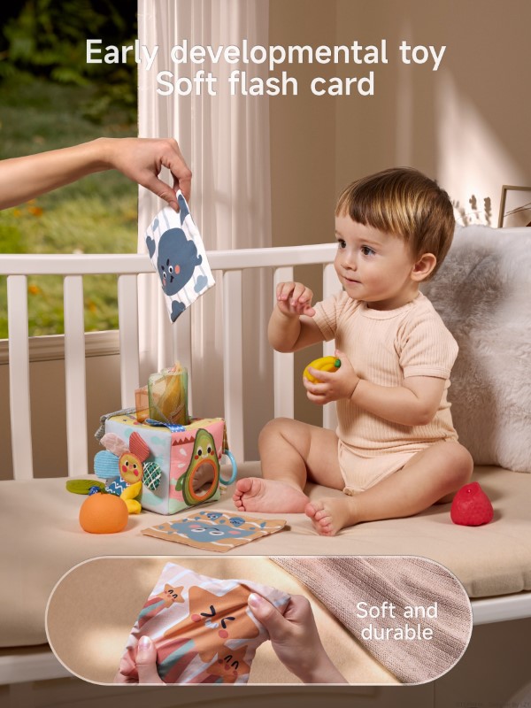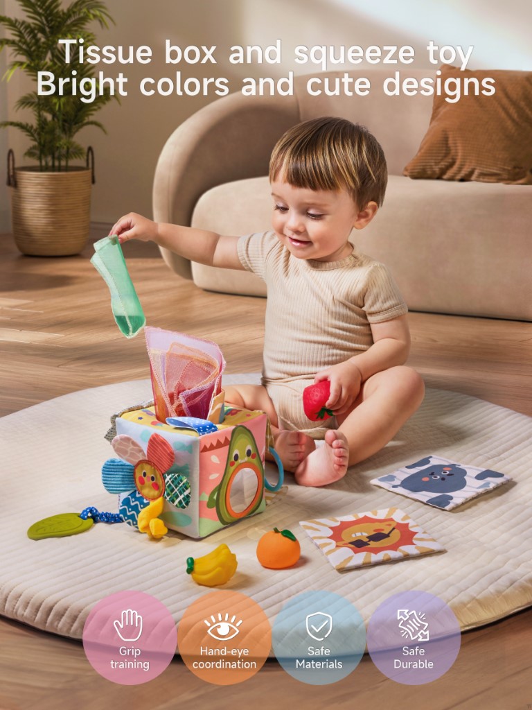 Each side of the tissue box offers a unique activity: a fun mirror for self-discovery, an apple and cloud with rustling (crinkle) paper, an elastic stretch sunflower, and textured tails. The included soft flash cards display playful weather illustrations, and the fruit squeeze toys make engaging sounds—helping develop fine motor skills, hand-eye coordination, and early cognitive abilities.