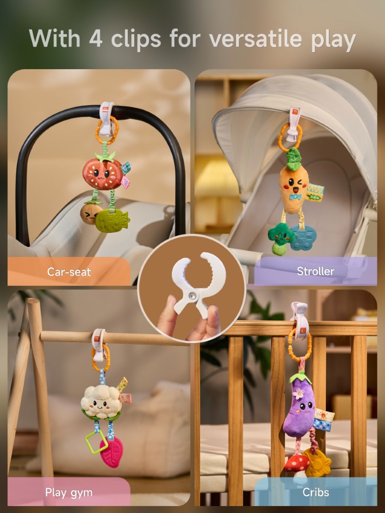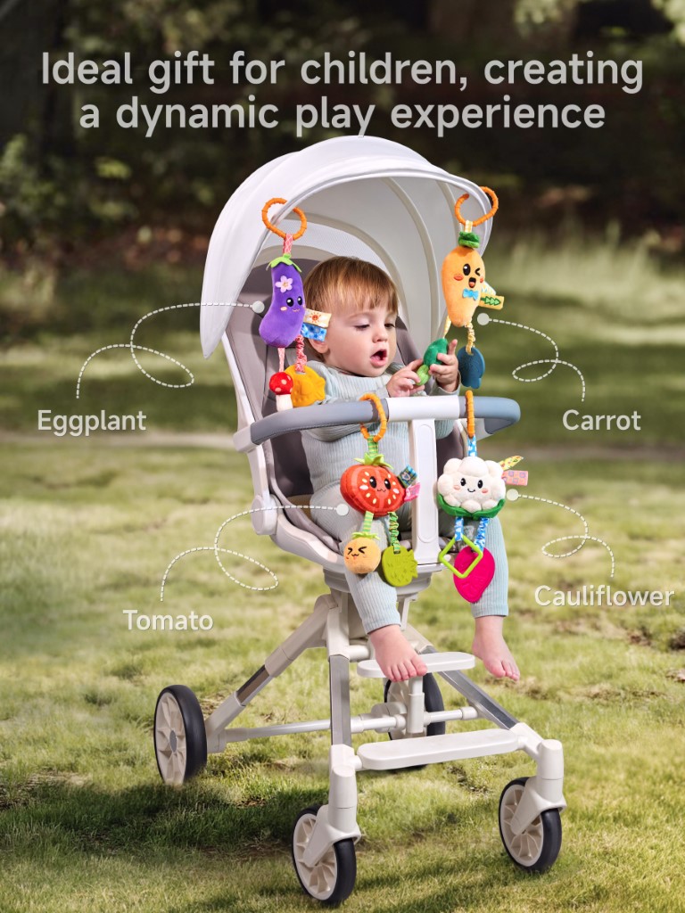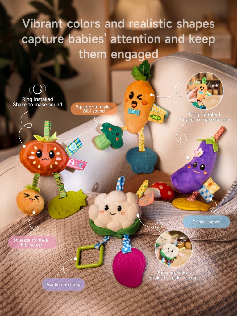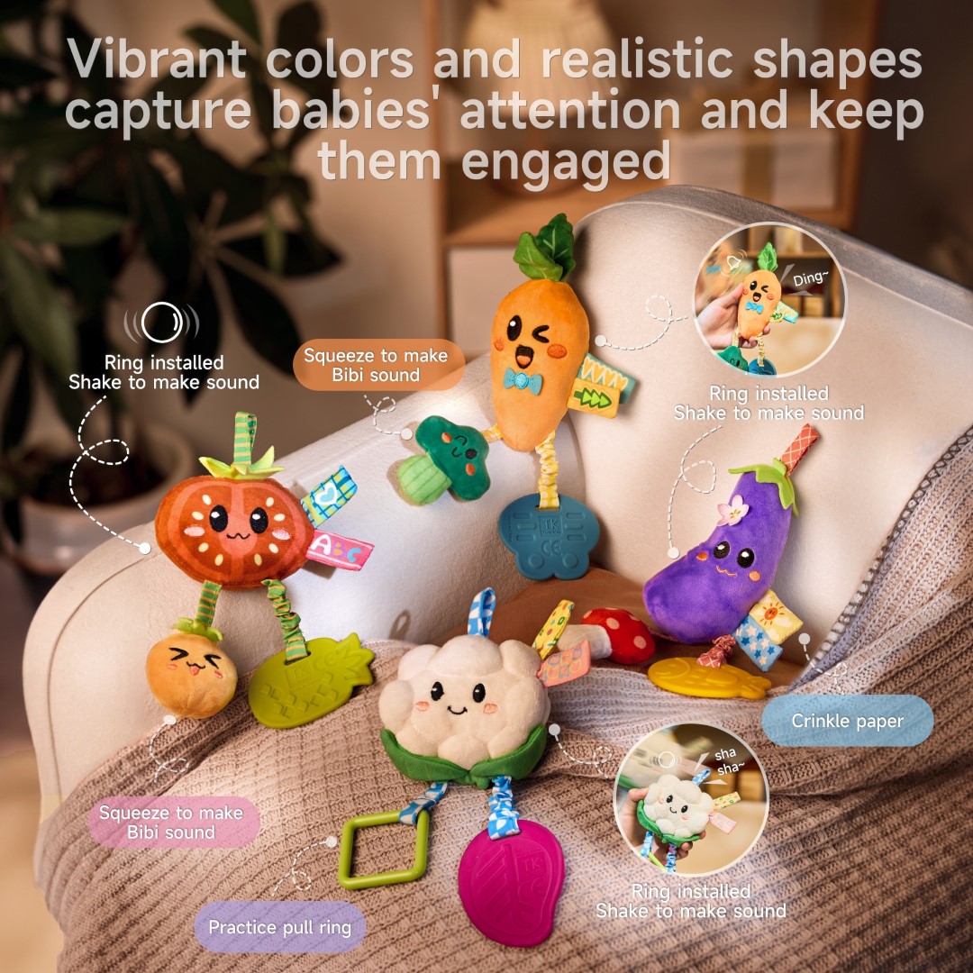 Hanging Baby Toy Set : Our vegetable plush toys include carrot, cauliflower, tomato and eggplant hanging toys, each rattle toy comes with a rattle, Bibi sound, crinkle texture and chewable teether. Designed to stimulate baby’s senses and encourage exploration.