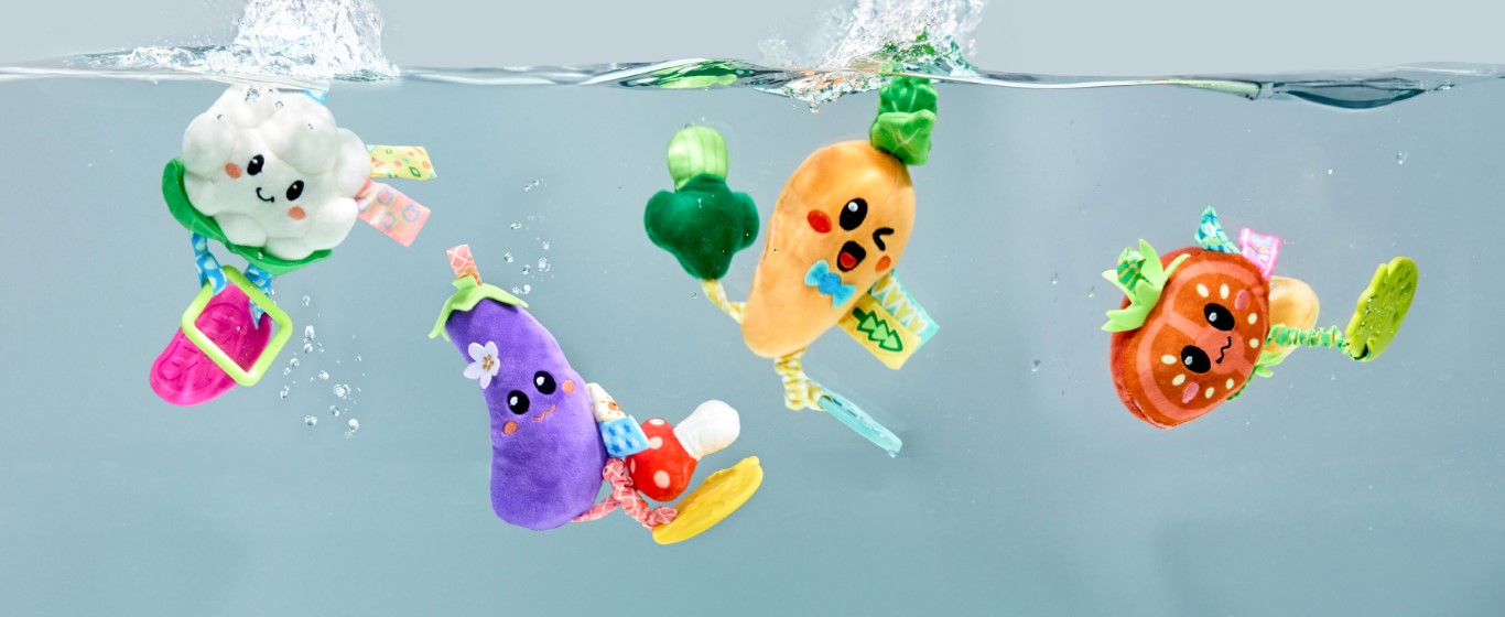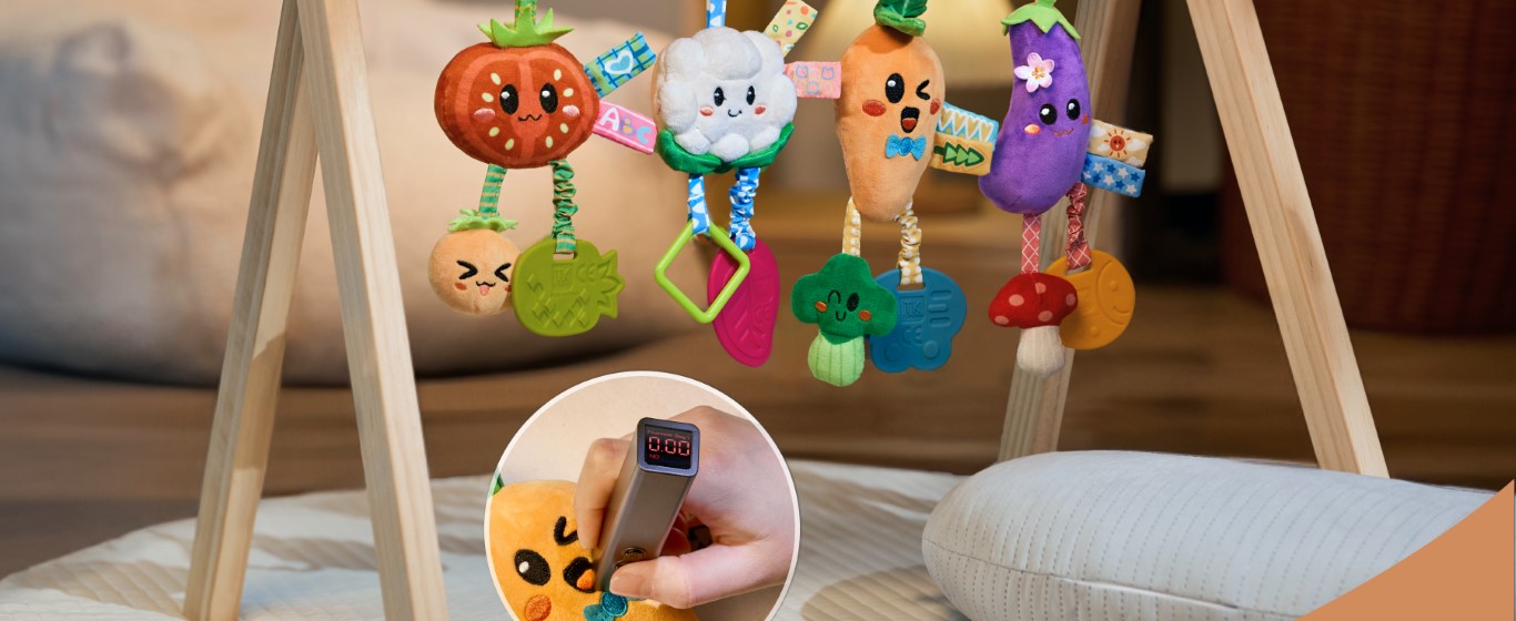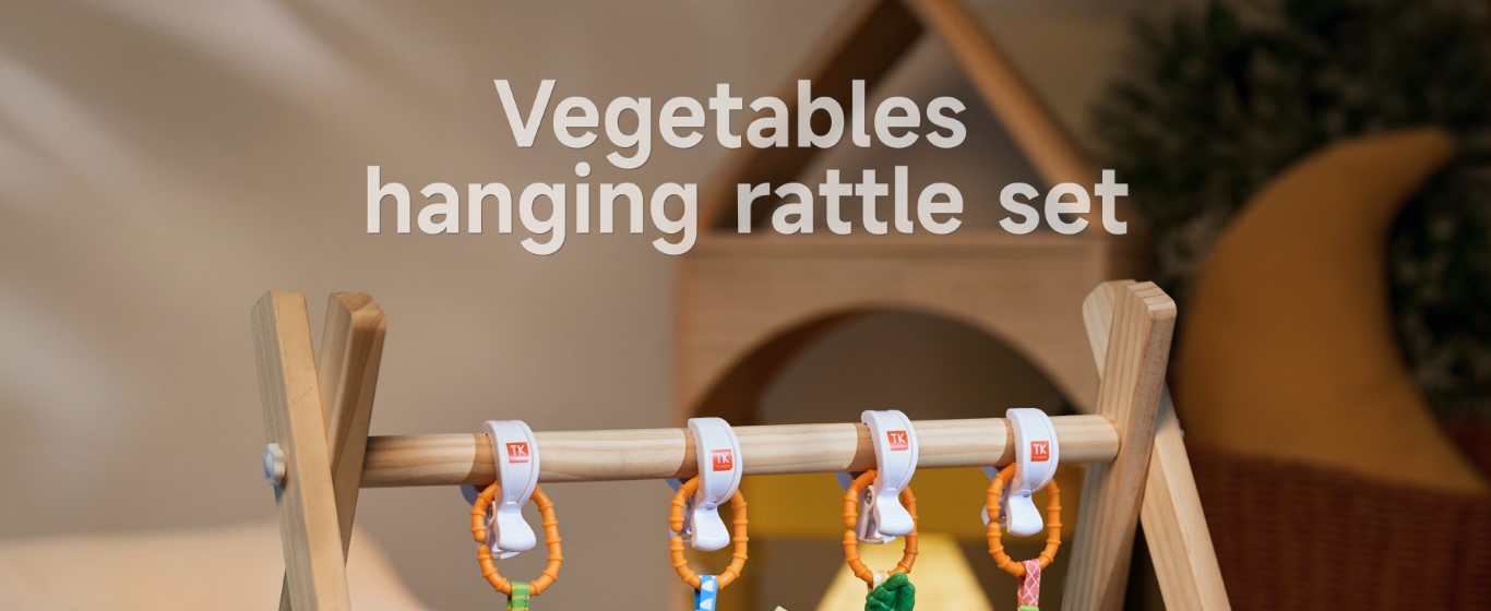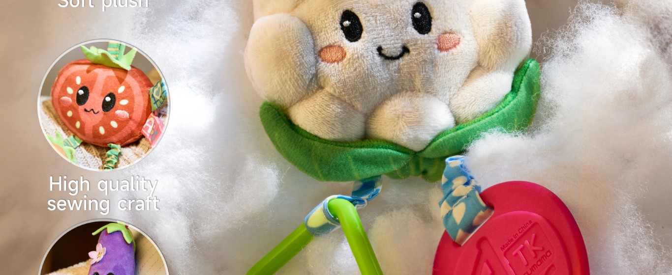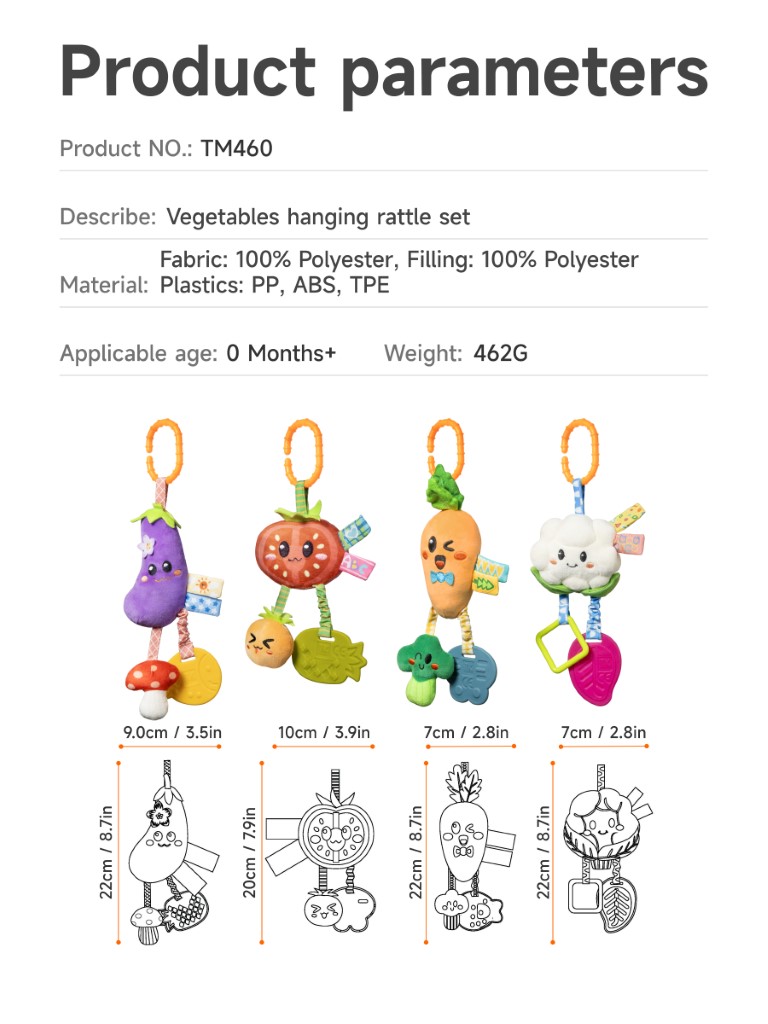 Hanging Baby Toy Set : Our vegetable plush toys include carrot, cauliflower, tomato and eggplant hanging toys, each rattle toy comes with a rattle, Bibi sound, crinkle texture and chewable teether. Designed to stimulate baby’s senses and encourage exploration.